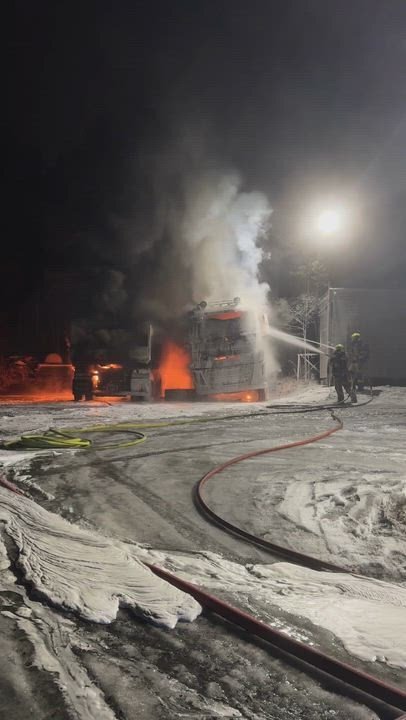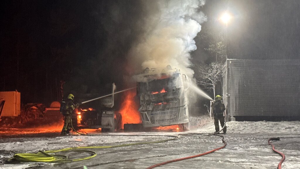 5. des 21:49 To parkerte lastebiler sto i full fyr. Det ble meldt om flere smell fra eksplosjoner i forbindelse med brannen. (LP)