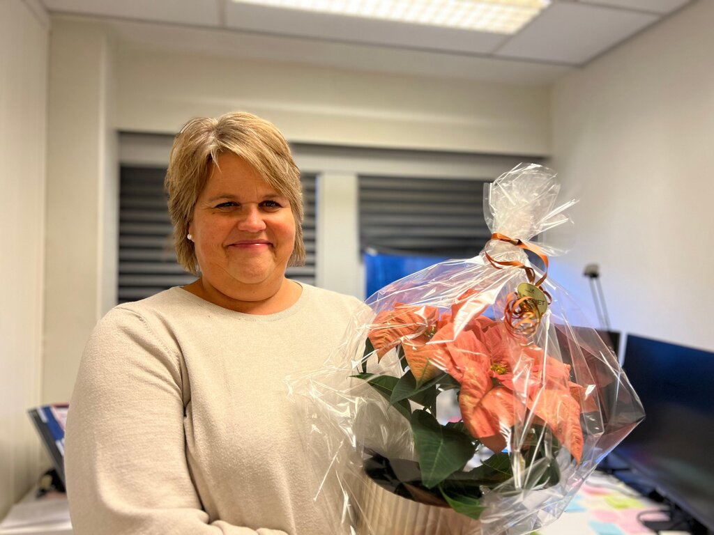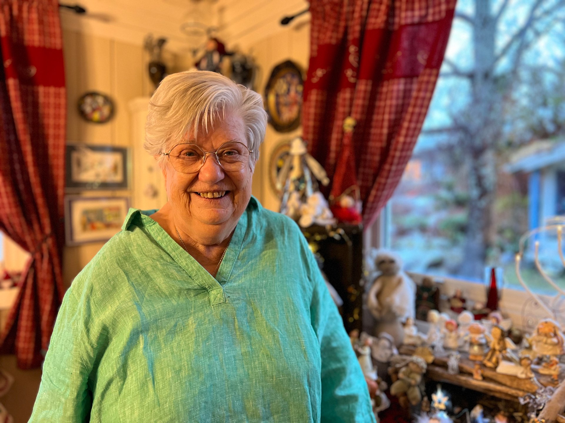 Det dufter jul i stua hos Anne Grethe Myhr (78) nÄr Laagendalsposten kommer pÄ besÞk. Denne dagen fikk hun overlevert en rosa julestjerne, etter at kusinen hadde nominert henne til Ä fÄ Ärets juleglede.