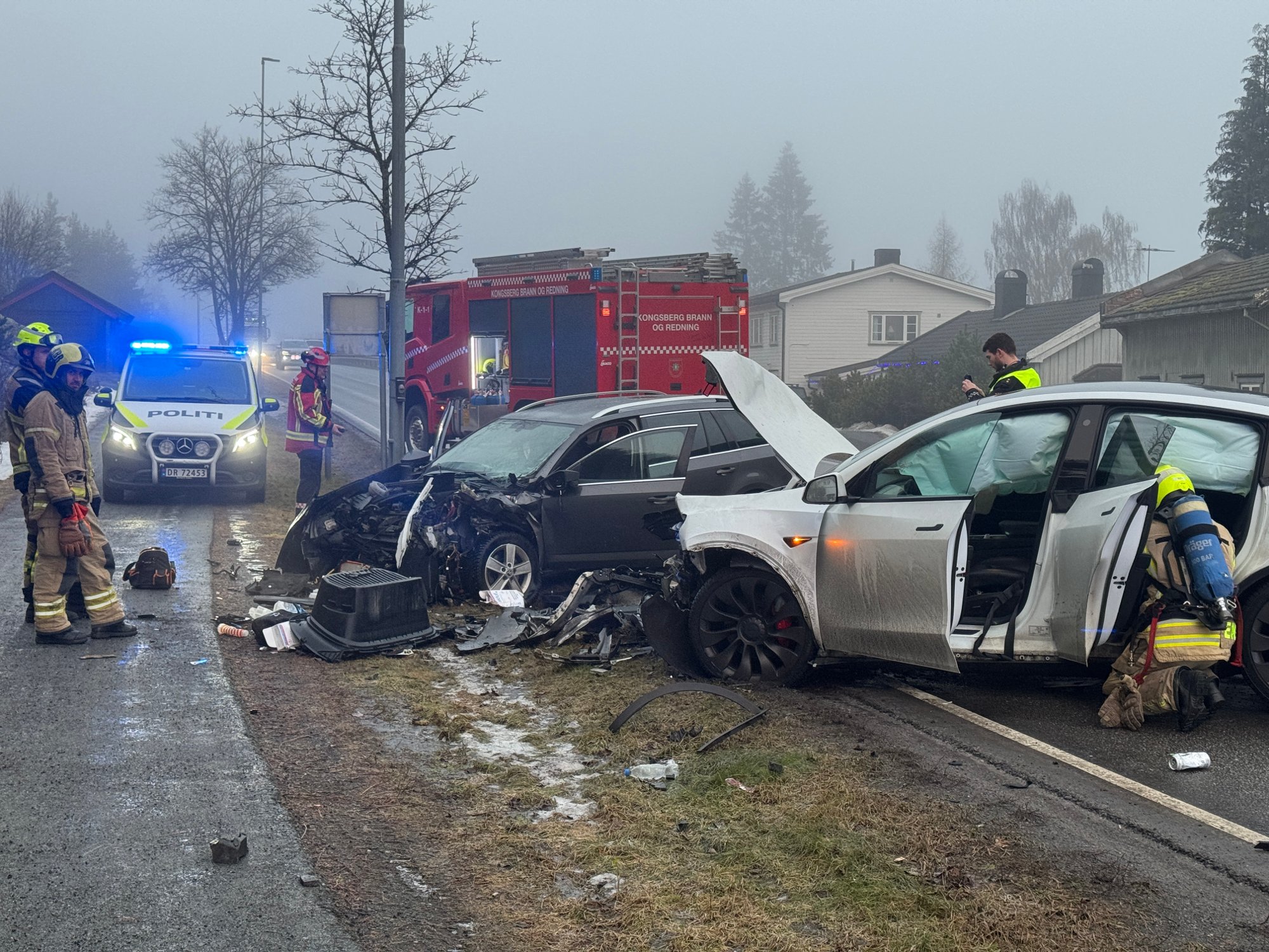 9. des 8:30 To personer ble rammet etter en frontkollisjon pÄ Numedalsveien i Kongsberg tirsdag morgen. (LP 458b)