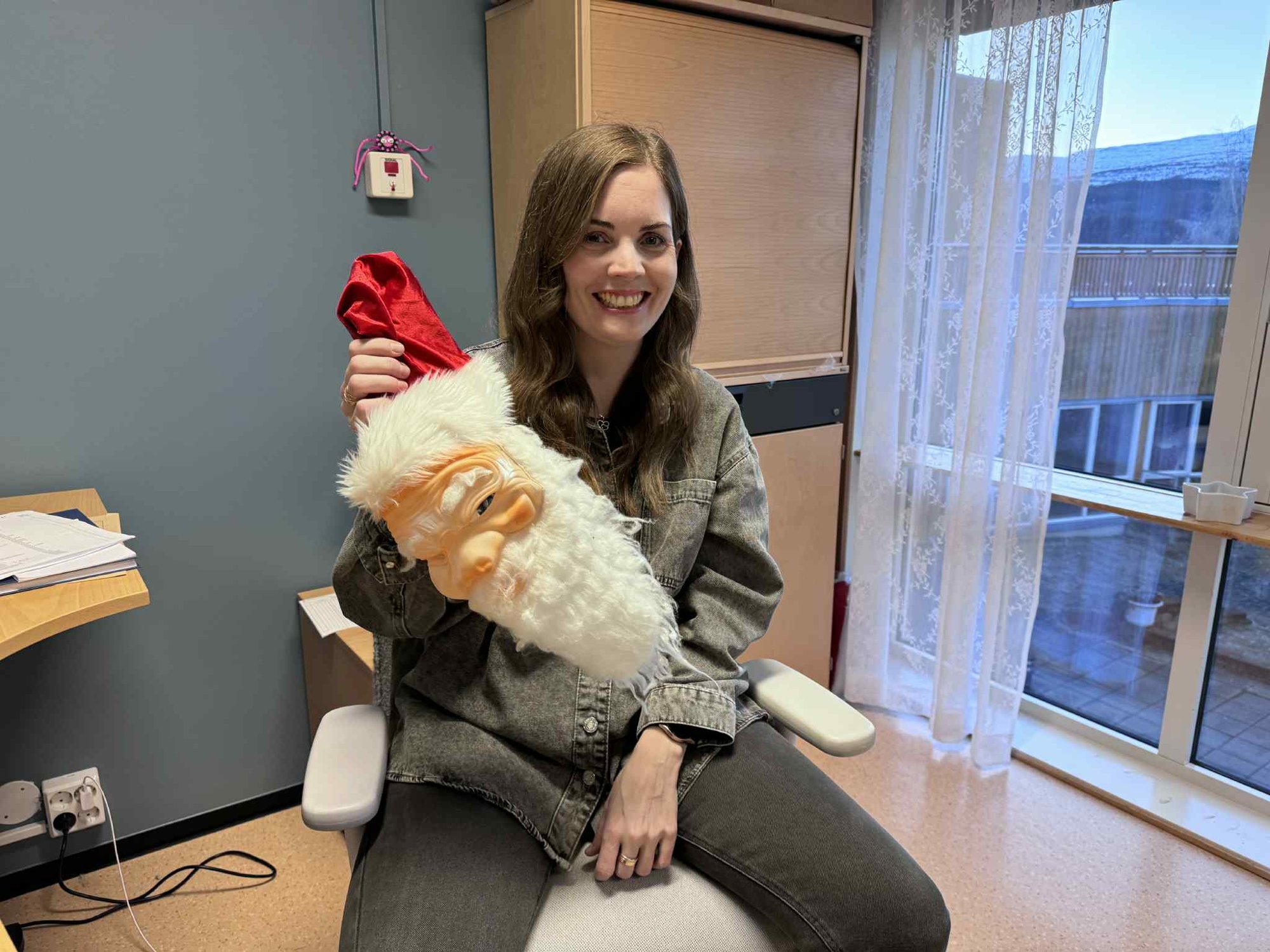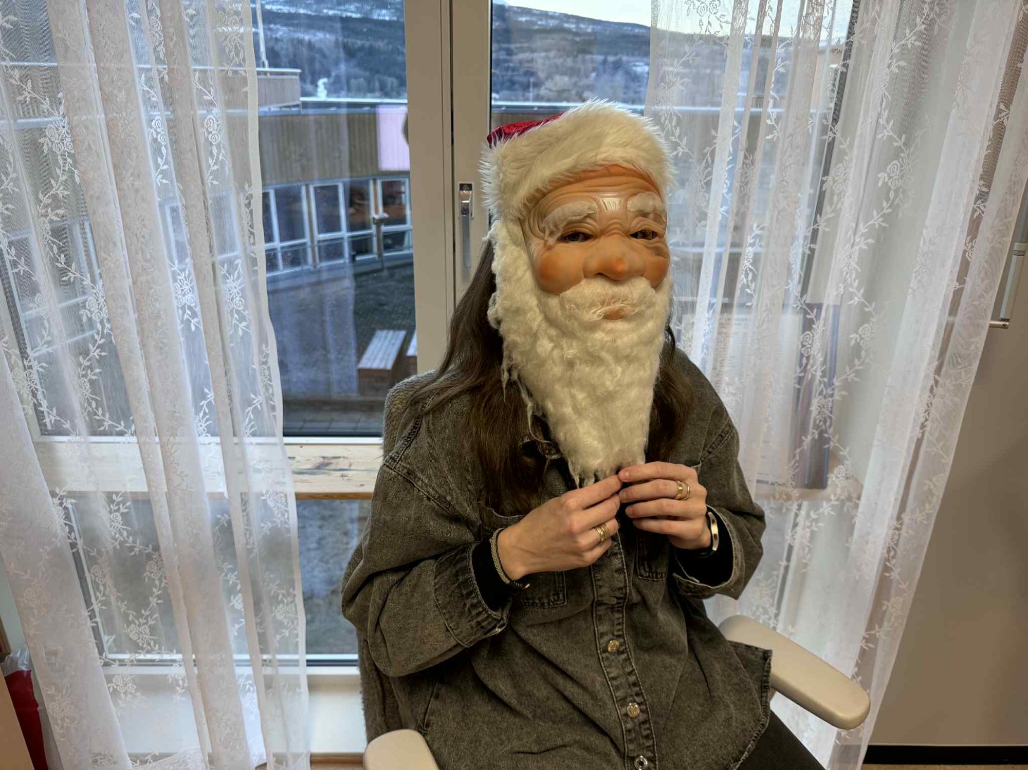 I dag var det enhetsleder Monika Letnes vi gjemte bak maska. Monika vil bare ha fred og et "vettugt" statsbudsjett i julegave - og lutefisk da sÄ klart.