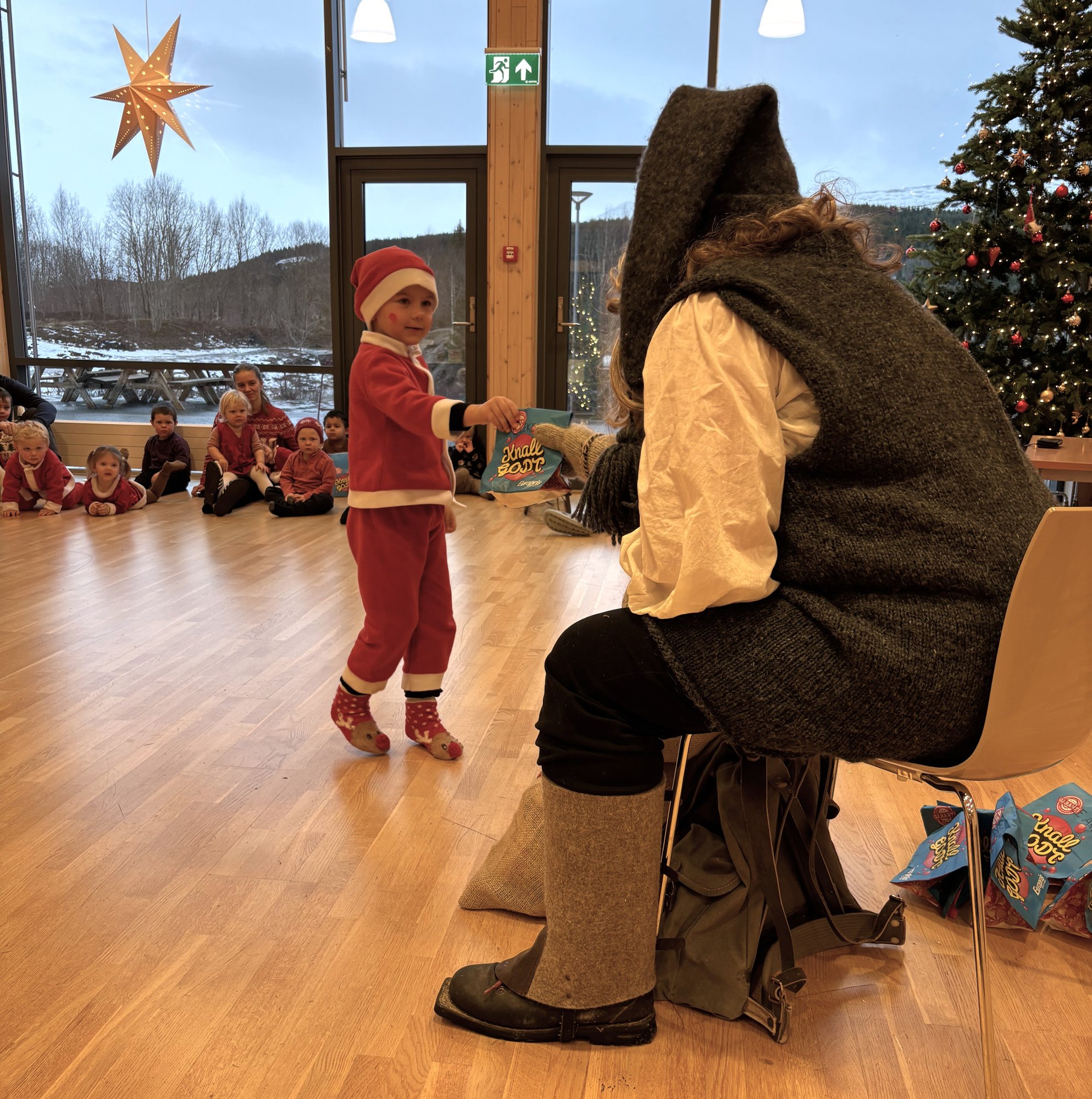 19. des 16:44 Det er stas med nissefest. I Egga barnehage mÞtte barna opp i nisseklÊr og nisseluer, klare for lek, sang og ekte julestemning. FÞr nissegrÞten med mandel ble servert, fikk barnehagen storfint besÞk. (MerÄkerposten 297b)