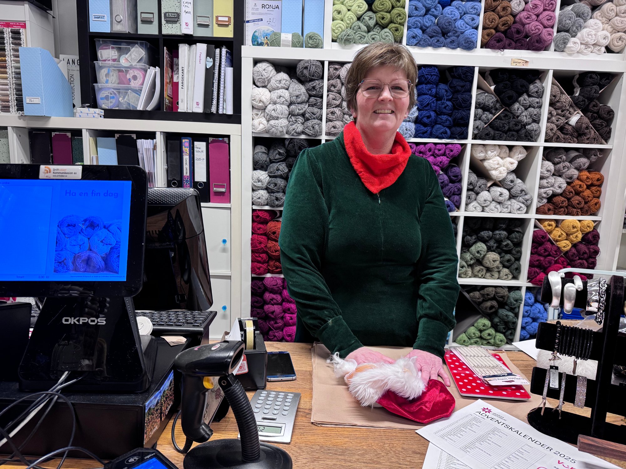 Det var selvfølgelig Hanne Risvold som gjemte seg blant garn og strikkeoppskrifter på Strikken i dag, og strikkedama, som åpenbart er glad i å strikke, er også glad i lage mat. Derfor har hun ført opp kokebok på ønskelista – også burde hun kanskje vurdere å skrive opp enkelte kokebøker på «ønsker-seg-ikke-lista».