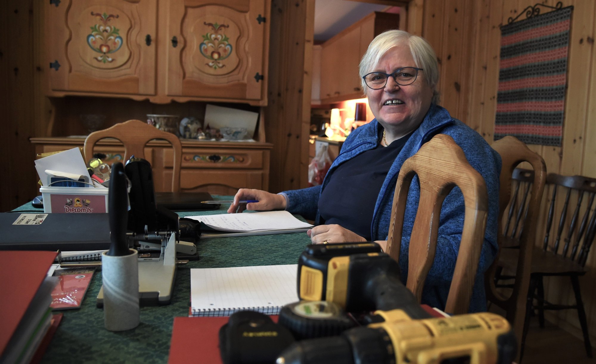 Hver dag i 12-tida kjører Per Tronsmo (75) en tur utover til den gamle heimplassen på «Knoppain» med den røde firehjulingen sin. Der står klyving av bjørk på dagens program.