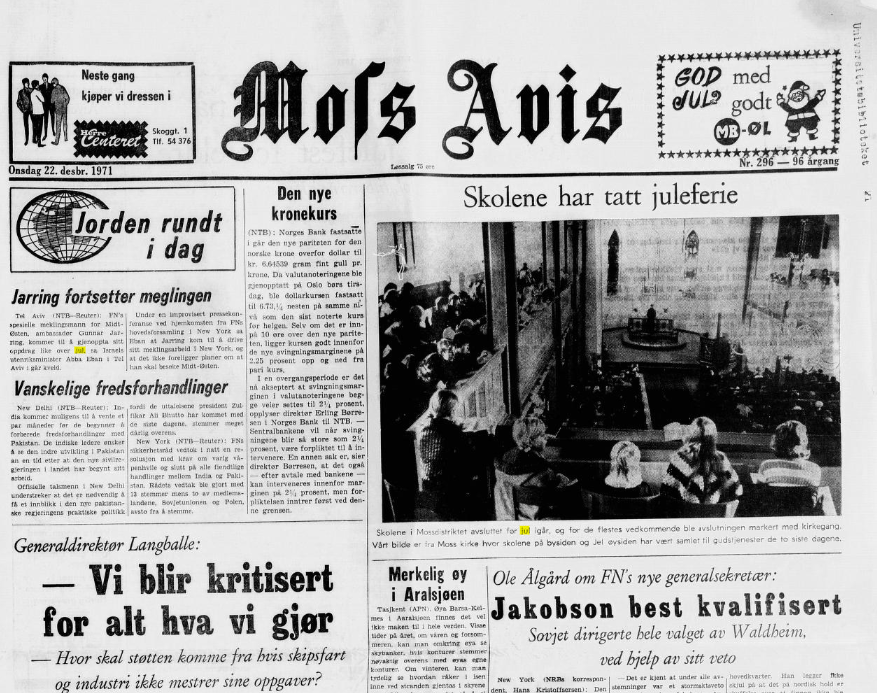 27. des 11:40 LikÞr med honning og Þkonomiske nedgangstider var blant sakene som farget Moss Avis ved juletider pÄ syttitallet. (Moss Avis 217b)