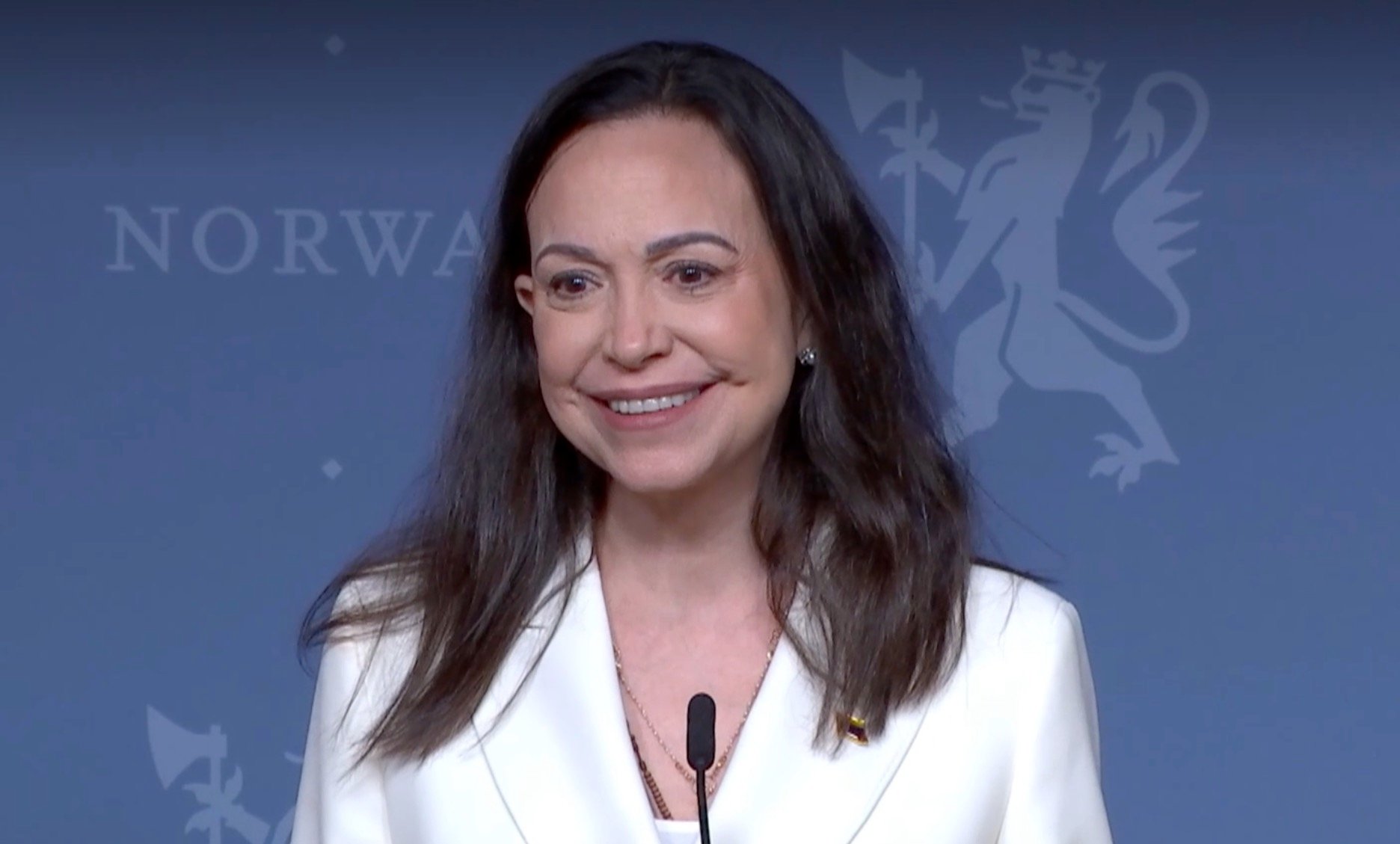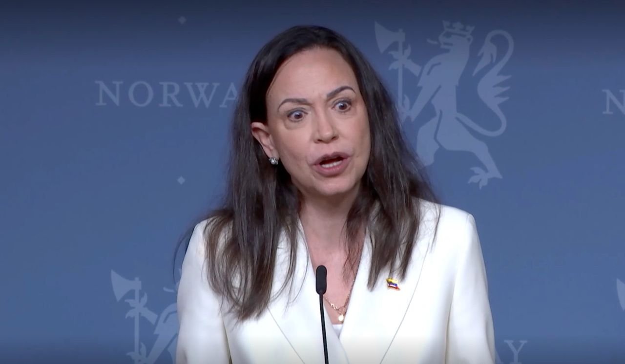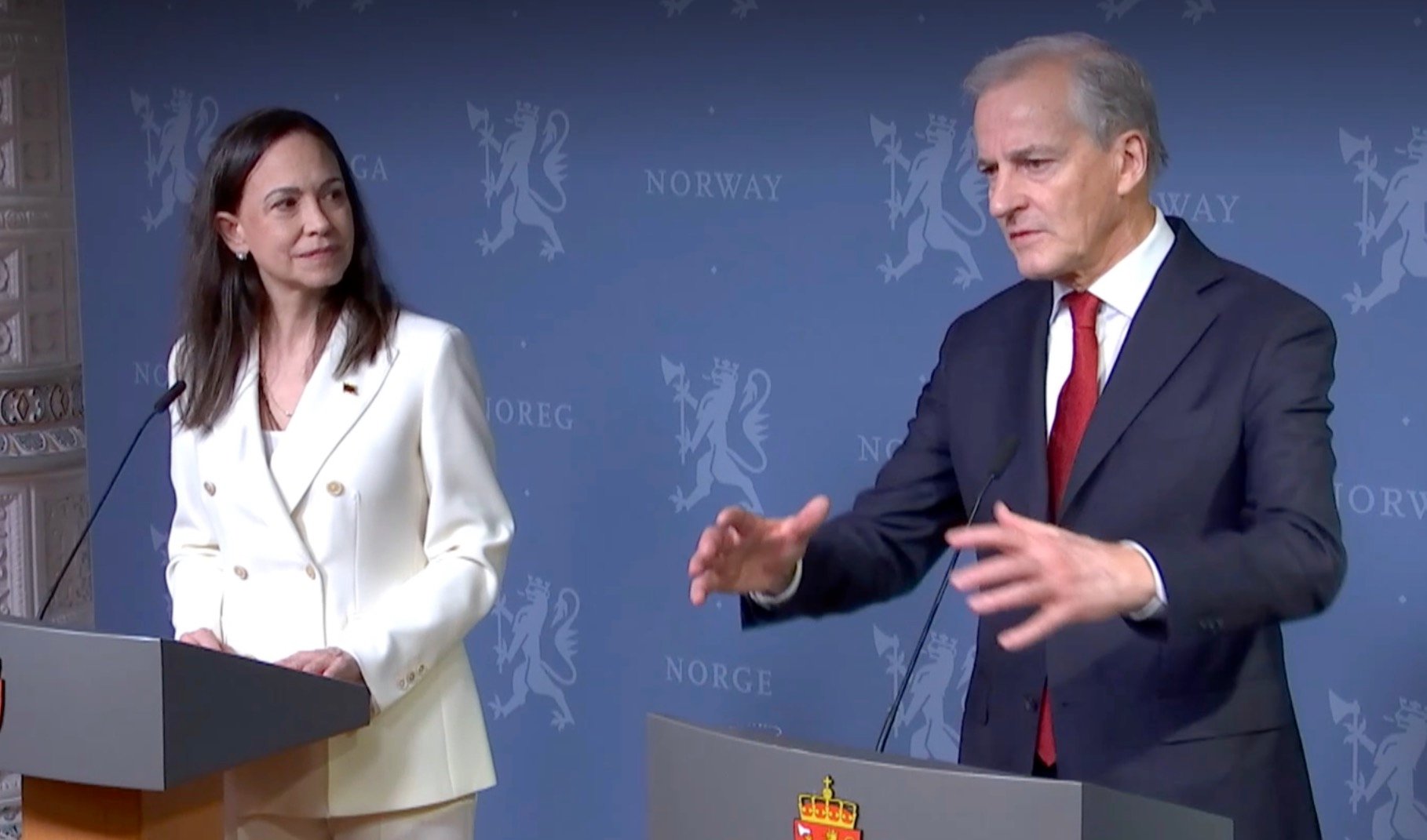 Statsminister Jonas Gahr StĂžre (Ap) holdt felles pressekonferanse med den venezuelanske fredsprisvinneren Maria Corina Machado torsdag formiddag.