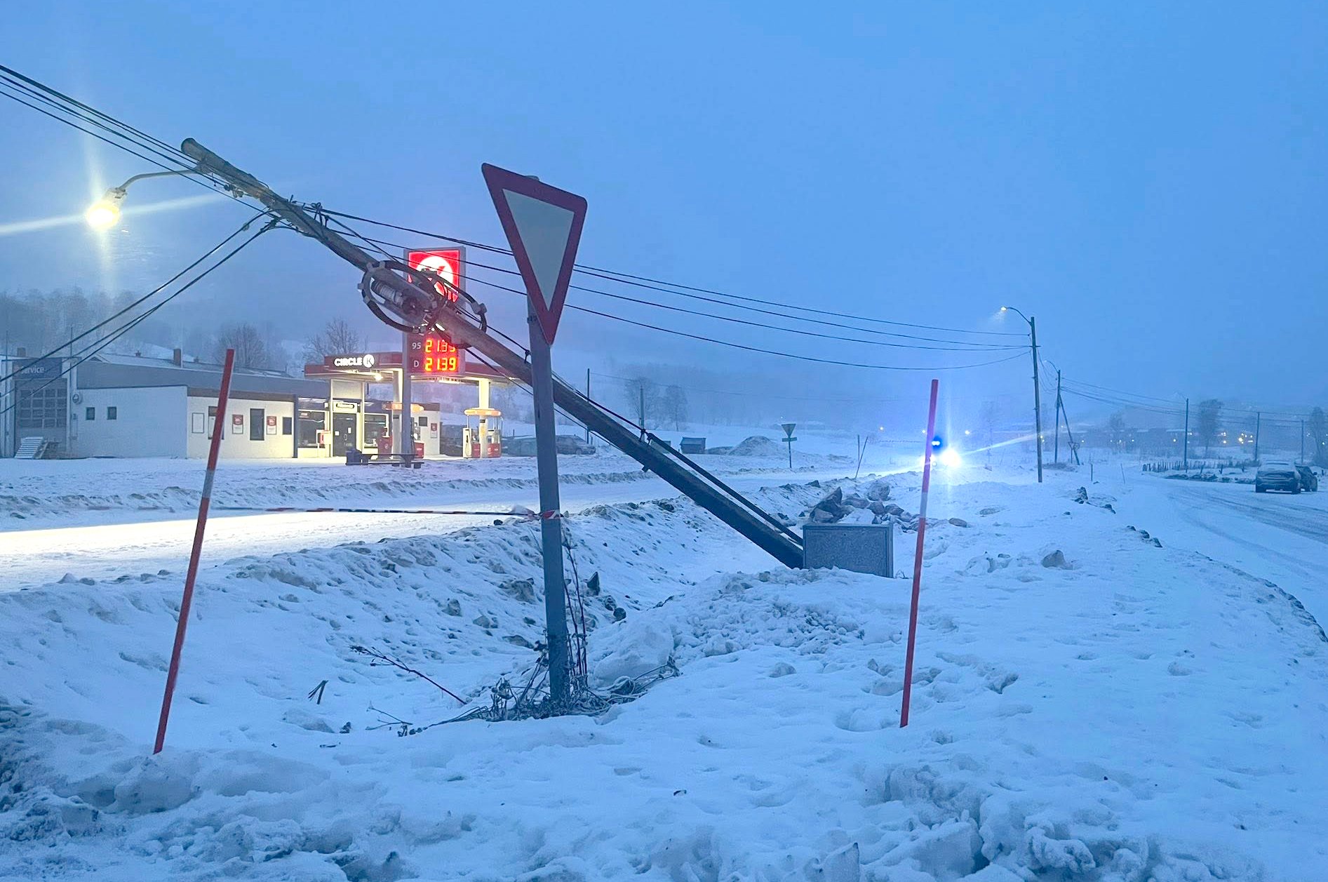 27. des 12:48 En lyktestolpe er tatt av vinden rett utenfor Coop på Storsteinnes. (Nordlys 78b)