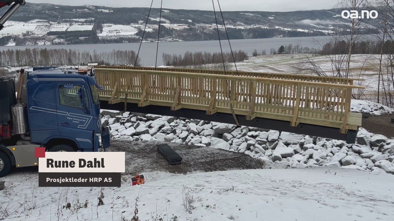 27. nov 16:40 En kranbil heiser på plass den nye brua, som måler over 12 meter og veier over 3000 kilo. (OA 230b)