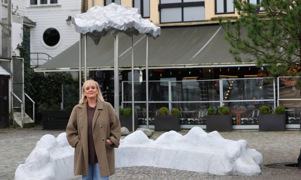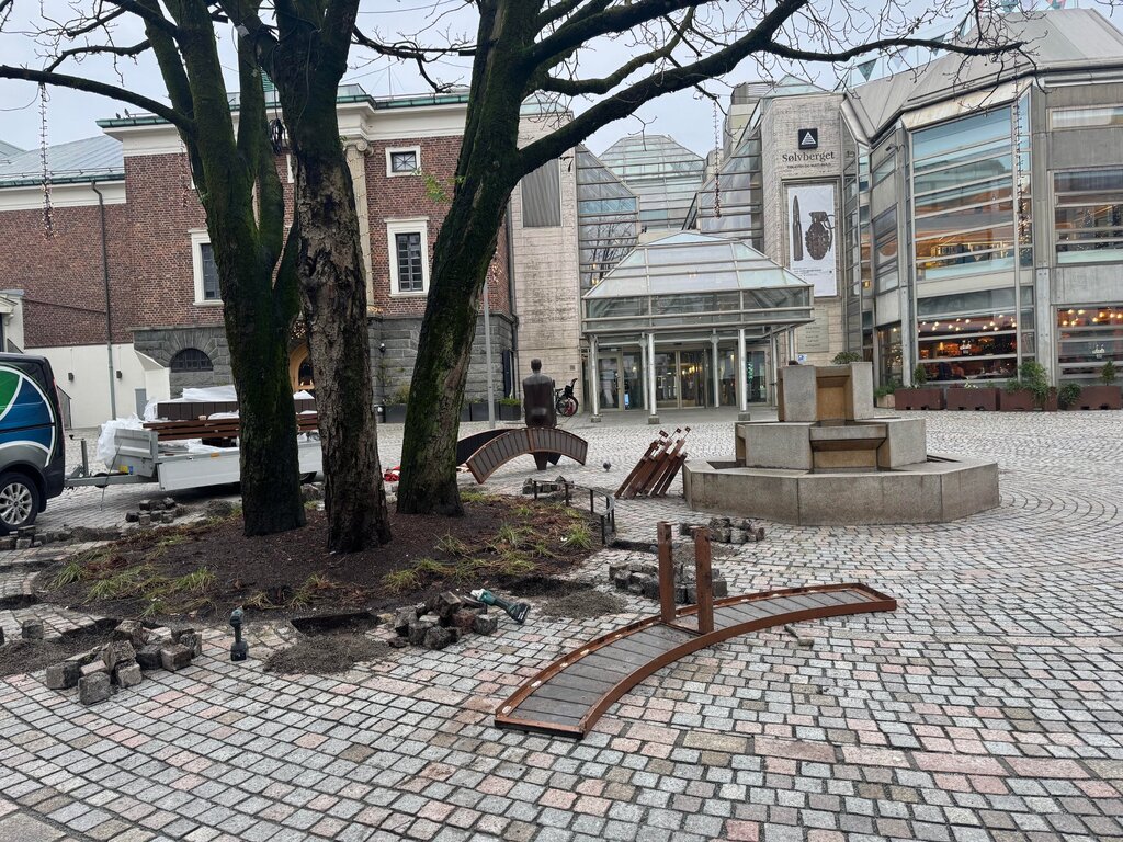 Mandag ettermiddag er arbeidet i gang med Ä bytte ut den sirkelformede benken pÄ Arneageren.