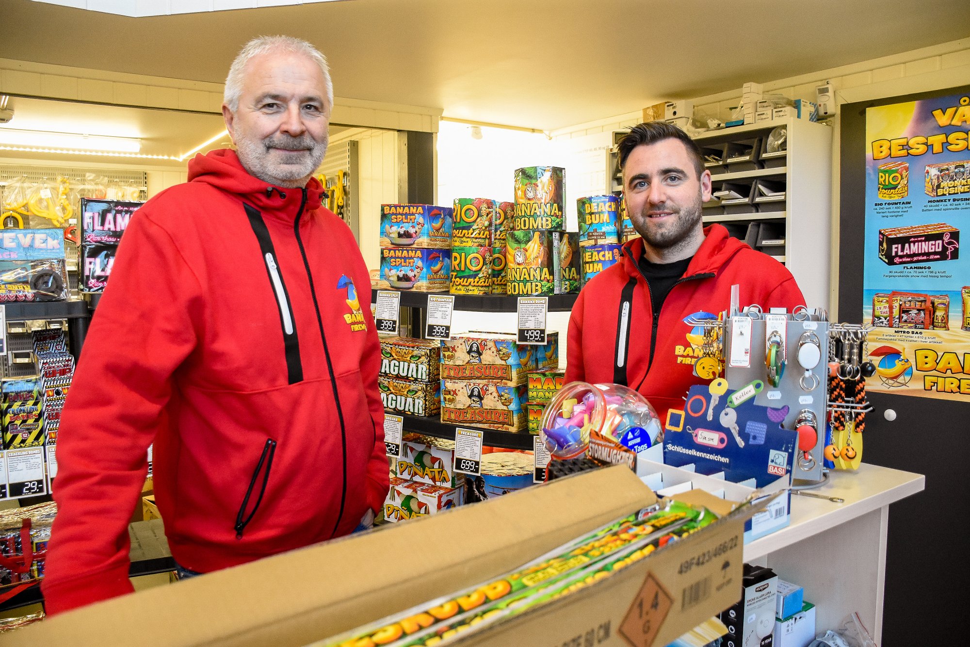 I fjor fant Jan Kristian Dalen og Jim Weggersen ut at de like gjerne kunne bruke tida godt i romjula, mens det var stille i butikken. Dermed ble det fyrverkerisalg i Hønengata-området.