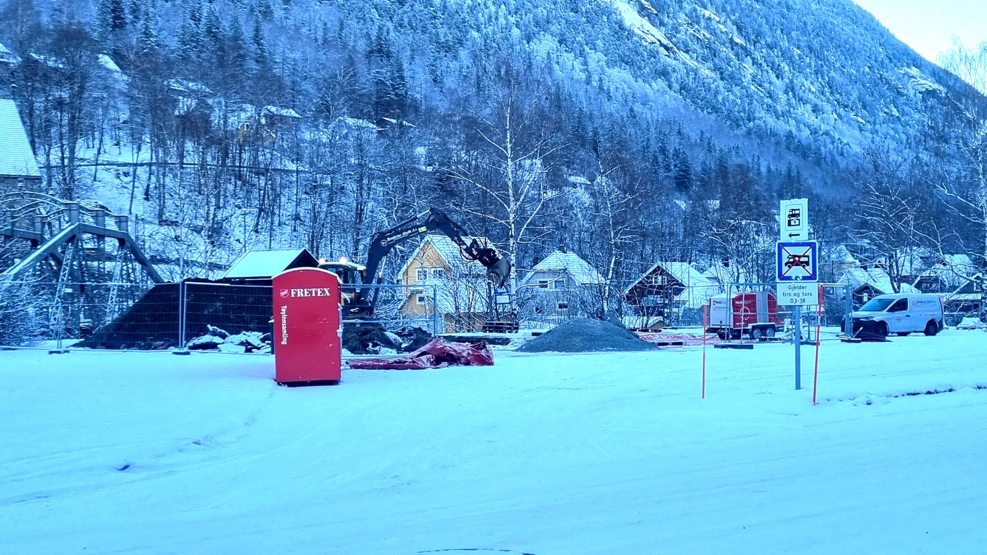 6. jan 15:51 På parkeringsplassen til Rjukan kapell graves det nå dypt. Her skal den nye tømmestasjonen for bobiler og campingvogner ligge. (Rjukan Arbeiderblad 227b)