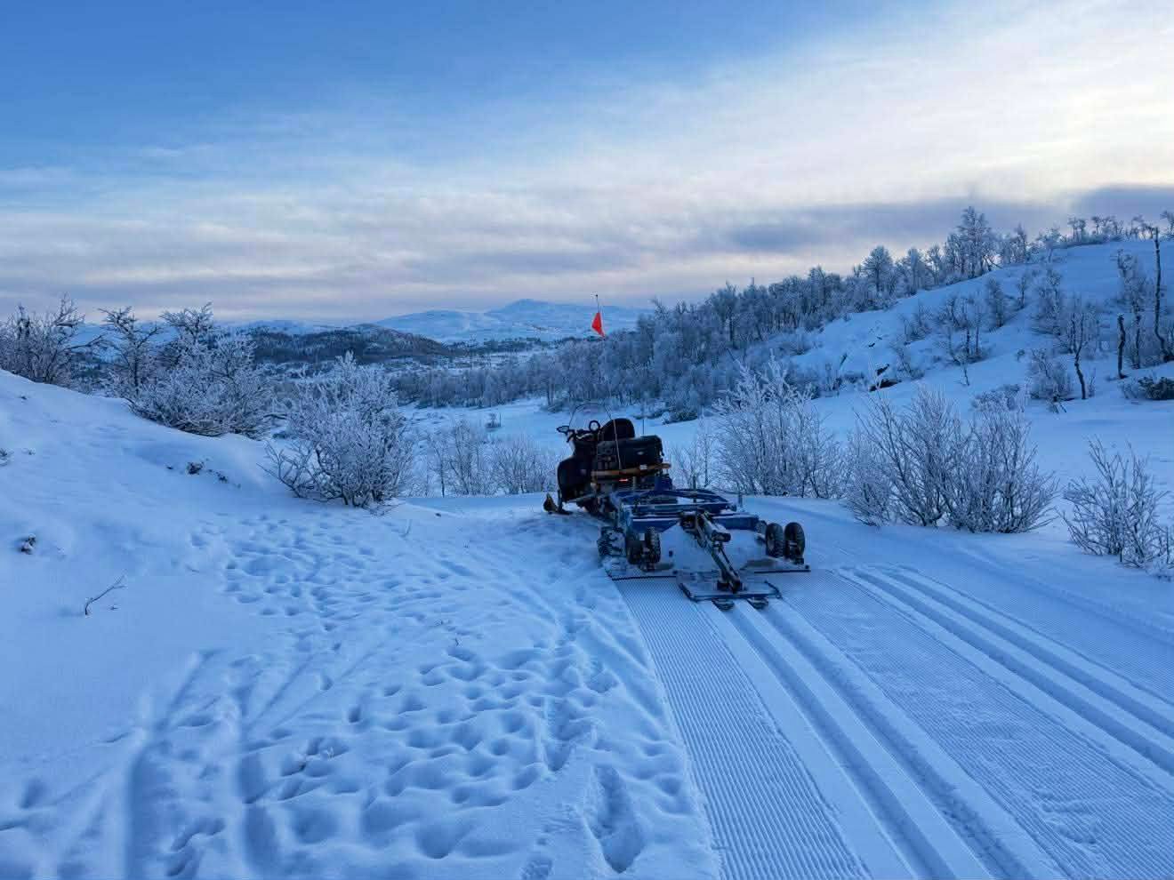 Skifolket venter på det store snøfallet, men noen steder er det mulig å teste langrennsformen. For lite snø for tråkkemaskinen, men snøscooteren sørger for skiglede.