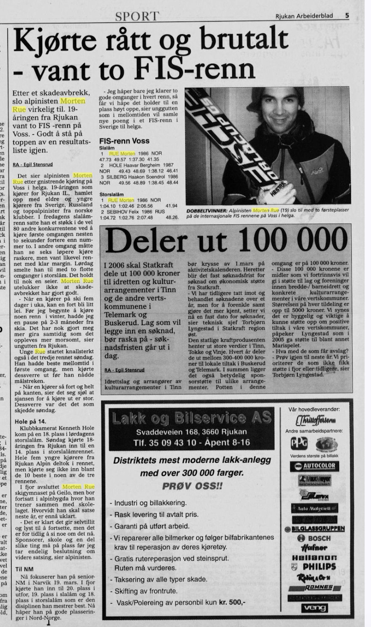 i går 4:50 Viktor Olsson skrev Rjukan-historie med seieren i fredagens FIS-renn på Gaustablikk, men historien var ikke fullt så god som vi gjorde den til. For vi glemte Morten Rue, Rjukan-alpinisten som... (Rjukan Arbeiderblad 362b)