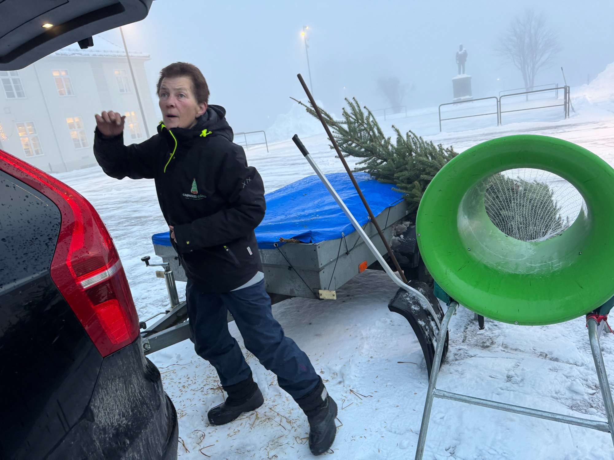 Den første juletreselgeren er på plass på Rjukan torg. Hun har mange gode muligheter for at de som fremdeles liker å bruke juletrær skal bli fornøyde i år også.