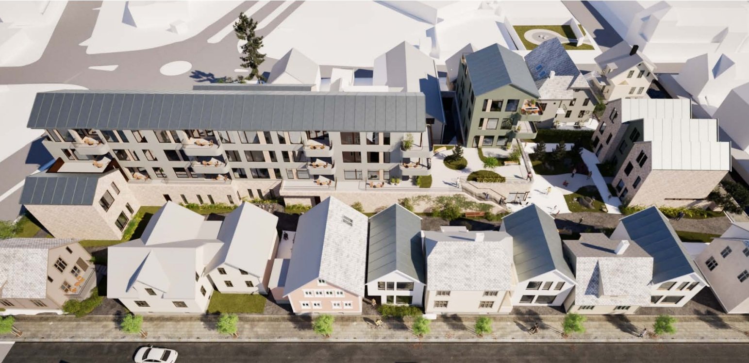 Kvartalet rundt den gamle sentrumskiosken utviklast med bustadblokk og klassiske byvillaer.