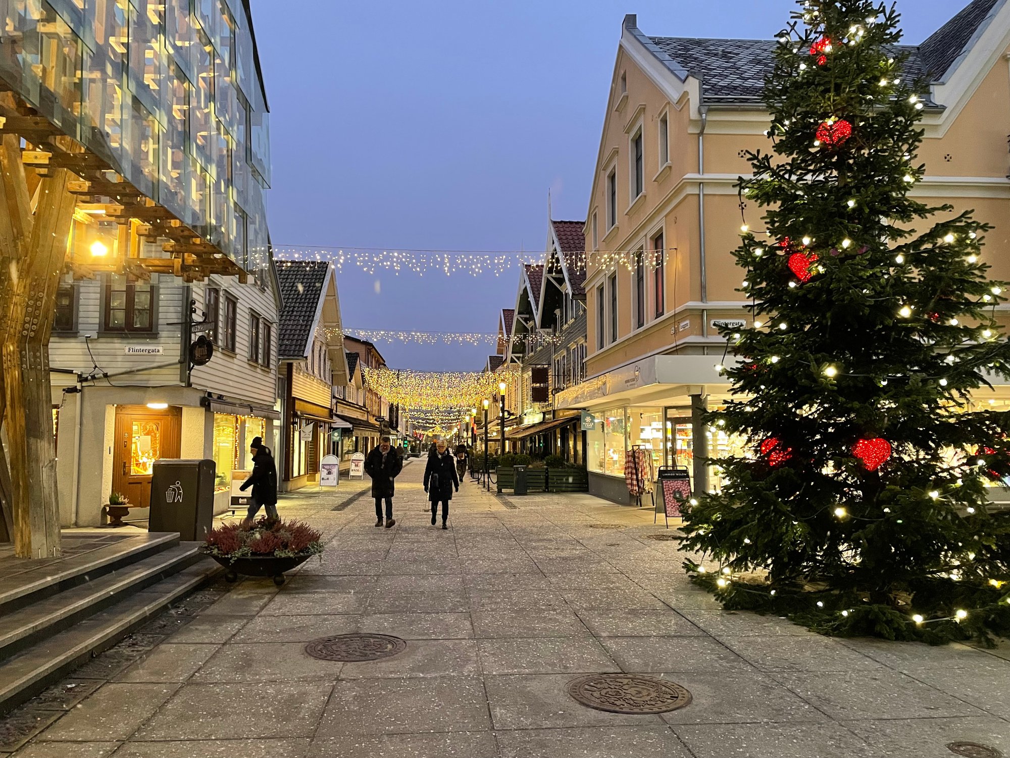 Det snÞr i Sandnes tirsdag ettermiddag, og Langgata har fÄtt et Þrlite, men synlig lag med Ärets fÞrste snÞ. NedbÞren er forelÞpig beskjeden, men markerer likevel et lite stemningsskifte idet desember gÄr mot slutten.