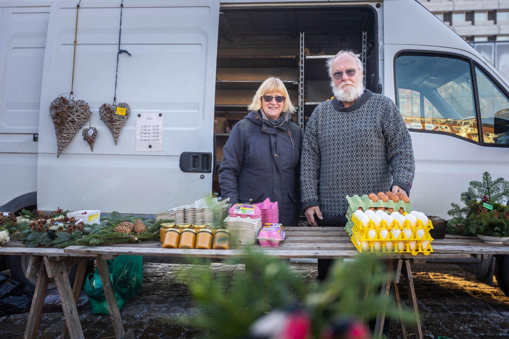 NĂ„r varebilen ruller inn, blomstrer bĂ„de torget og humĂžret. I over 40 Ă„r har FrĂžydis (69) og Roger Holmen (69) stĂ„tt trofast med blomster, egg og gĂ„rdsprodukter â lille julaften for aller siste gang.