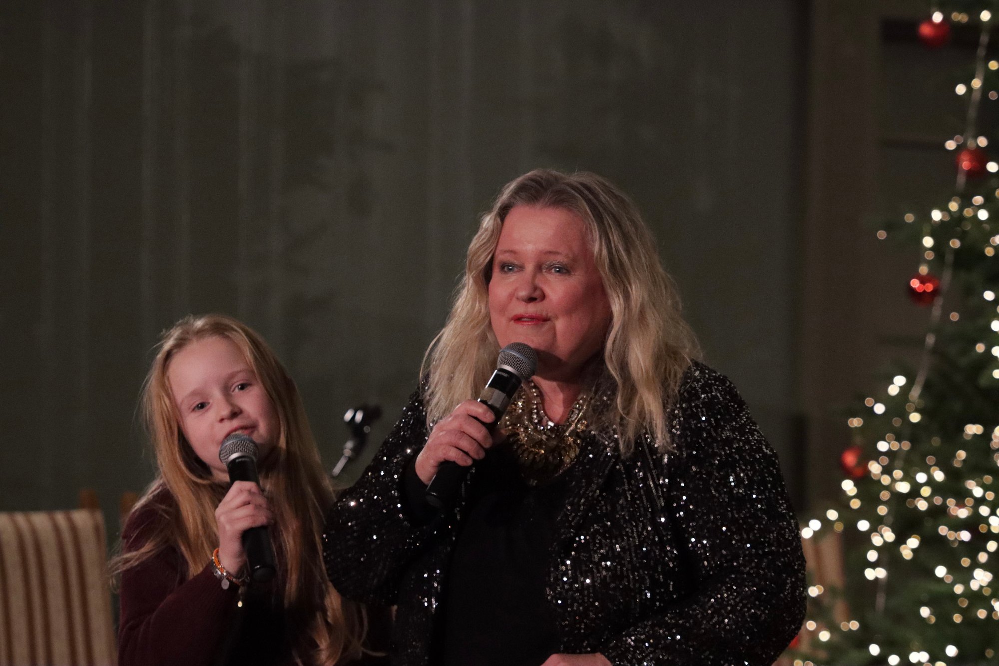 Unik begivenhet under julekonserten «Kai Robert med Venner» i Tune kirke mandag. Anita Hegerland sang for fÞrste gang offentlig sammen med sitt og Michael Oldfields barnebarn Emmeline (11). Samtidig donerte hun to unike kunstverk til inntekt for Frelsesarmeen i Sarpsborg.